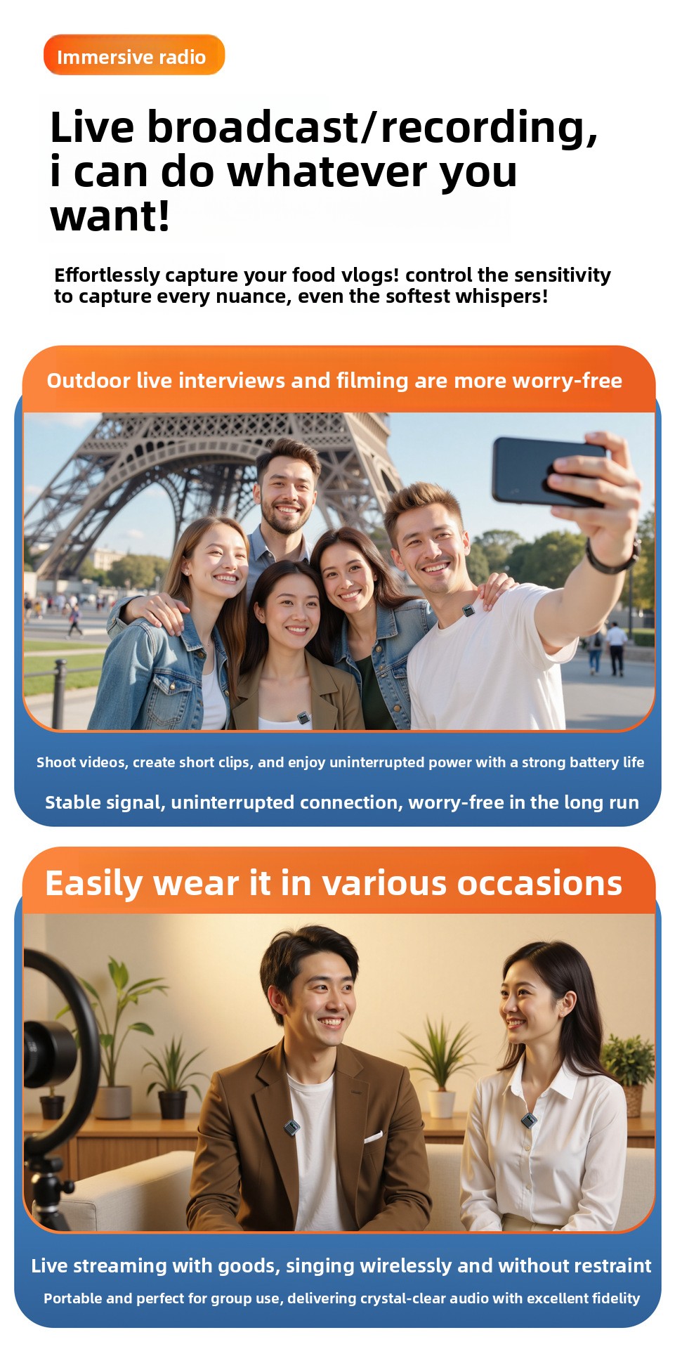 Wireless: Cord-free lavalier microphone for flexible mobility during recording.